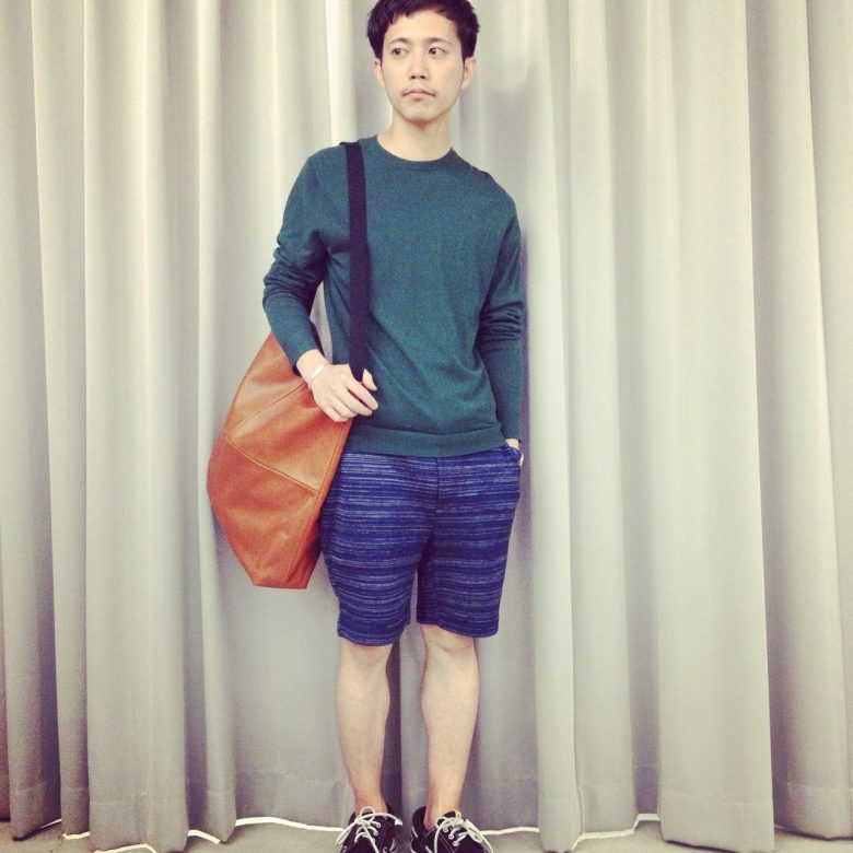 初夏の休日には、ハイゲージニットとスウェットショーツのスタイルで。