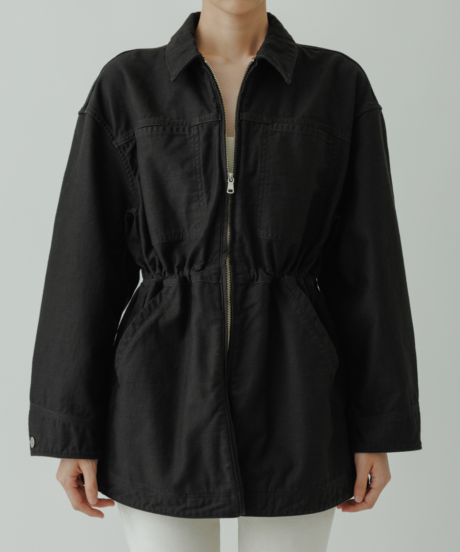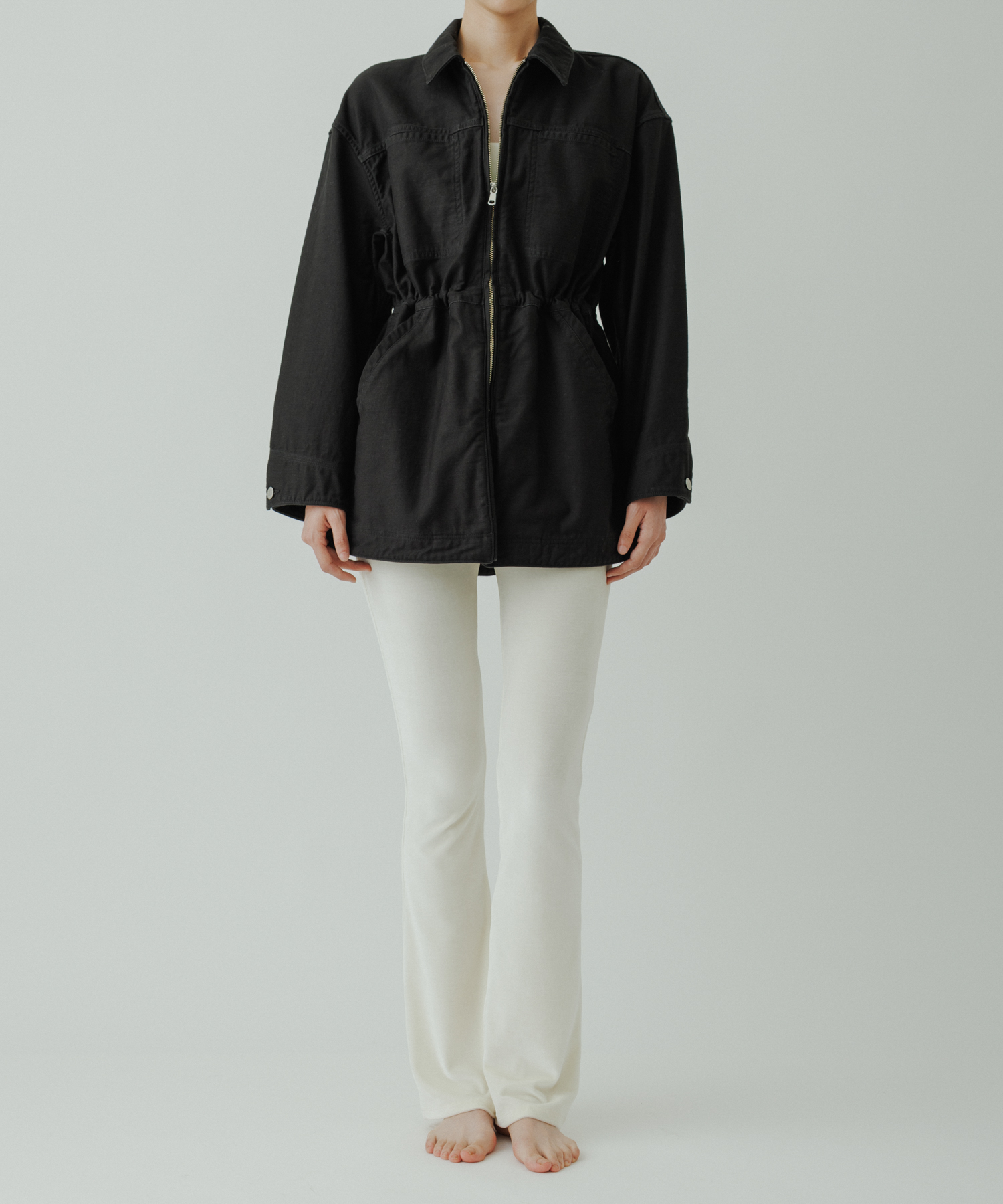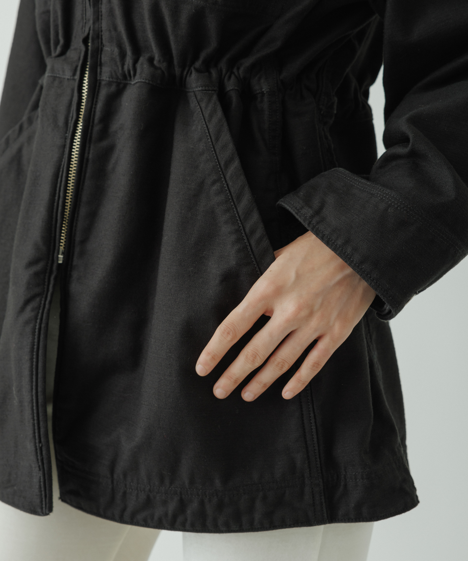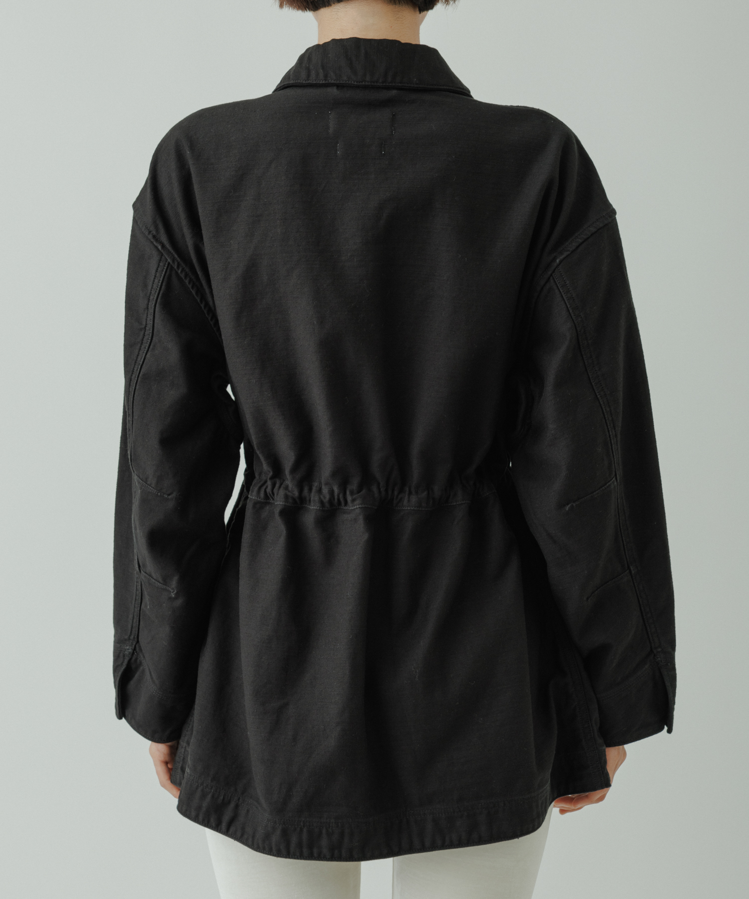 ウエスト部分が美しくシェイプされるようにドローストリングが付属。締めることでギャザーが寄り、ウエストラインが強調されることによって、スタイリングにメリハリが生まれます。緩めれば、ボクシーシルエットのまま、メンズライクな着こなしも。自由なスタイルで着用いただけます。