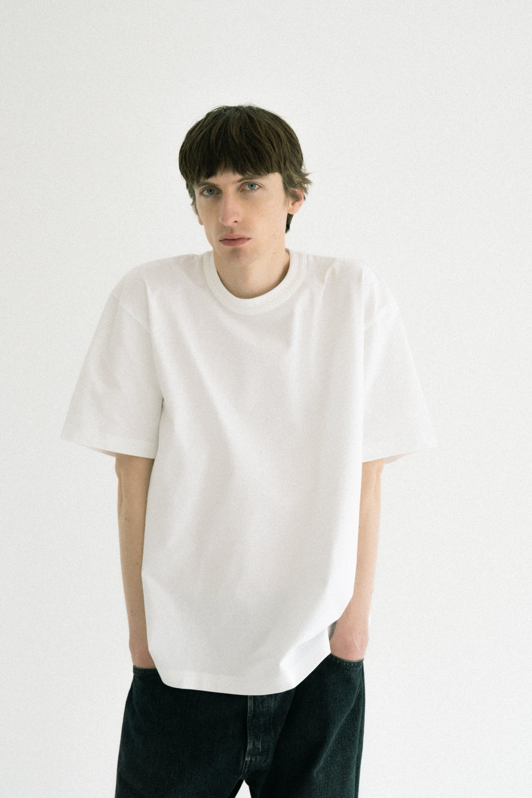 リラックス感とクリーンなムードを備えた最新モデルでは、ほどよく滑らかなタッチの 20 番手単糸で編み立てたリングスパンコットンを使用。