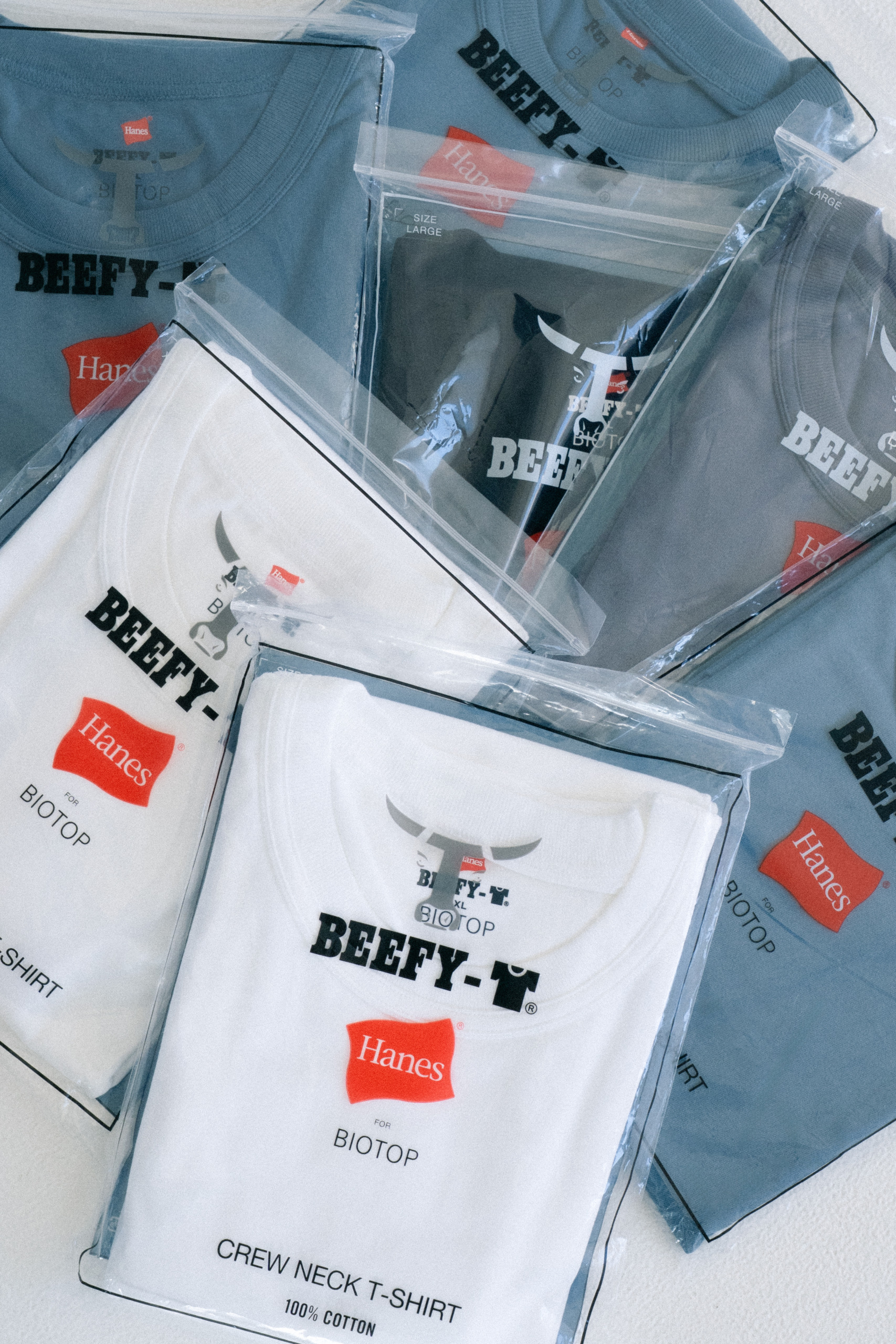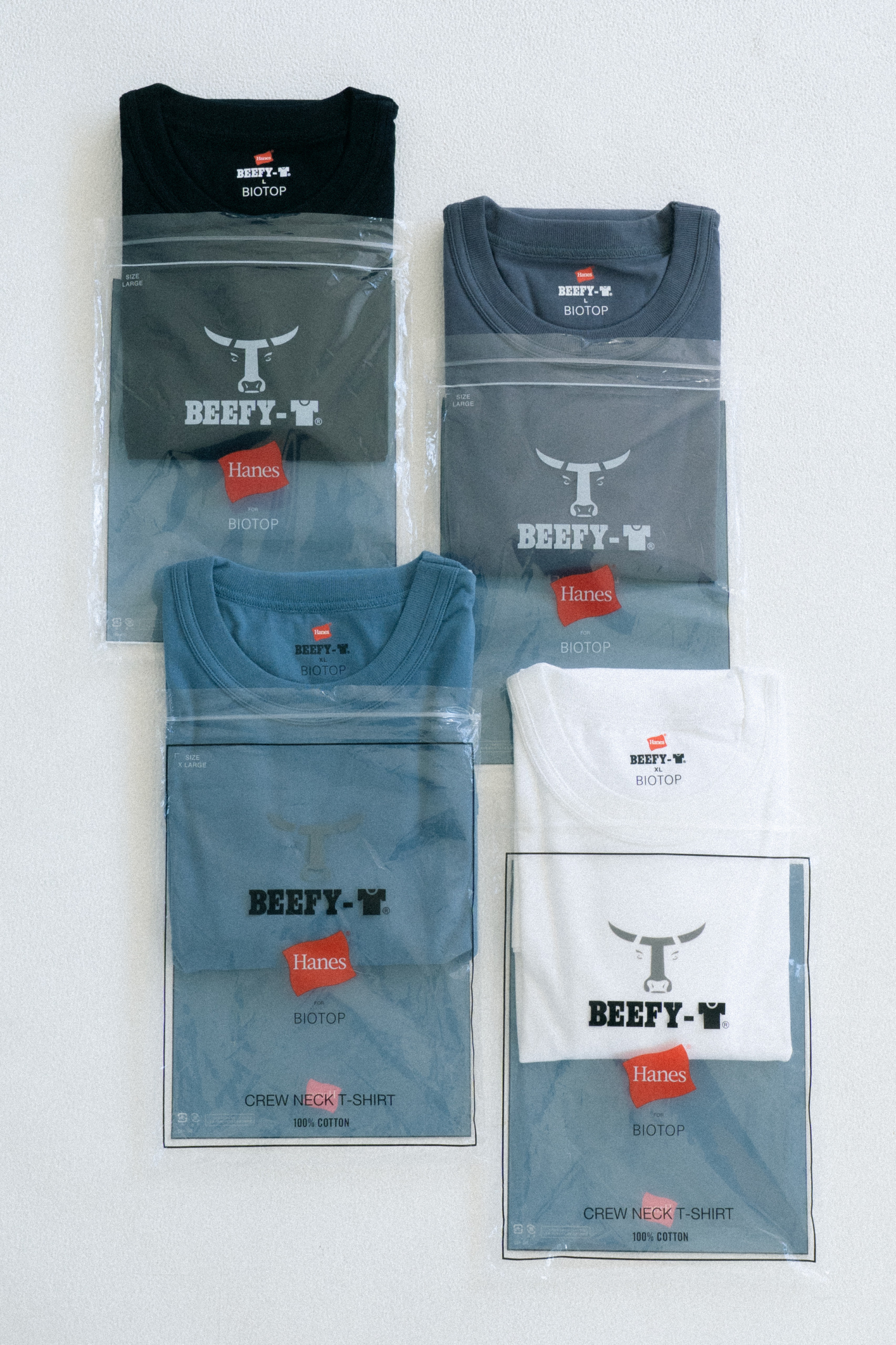ヘビーウェイトTシャツの代名詞であると同時にHanes 屈指のシグネチャーモデルとされる、6.1オンスのBEEFYコットンジャージー (天竺) 生地をセレクト。