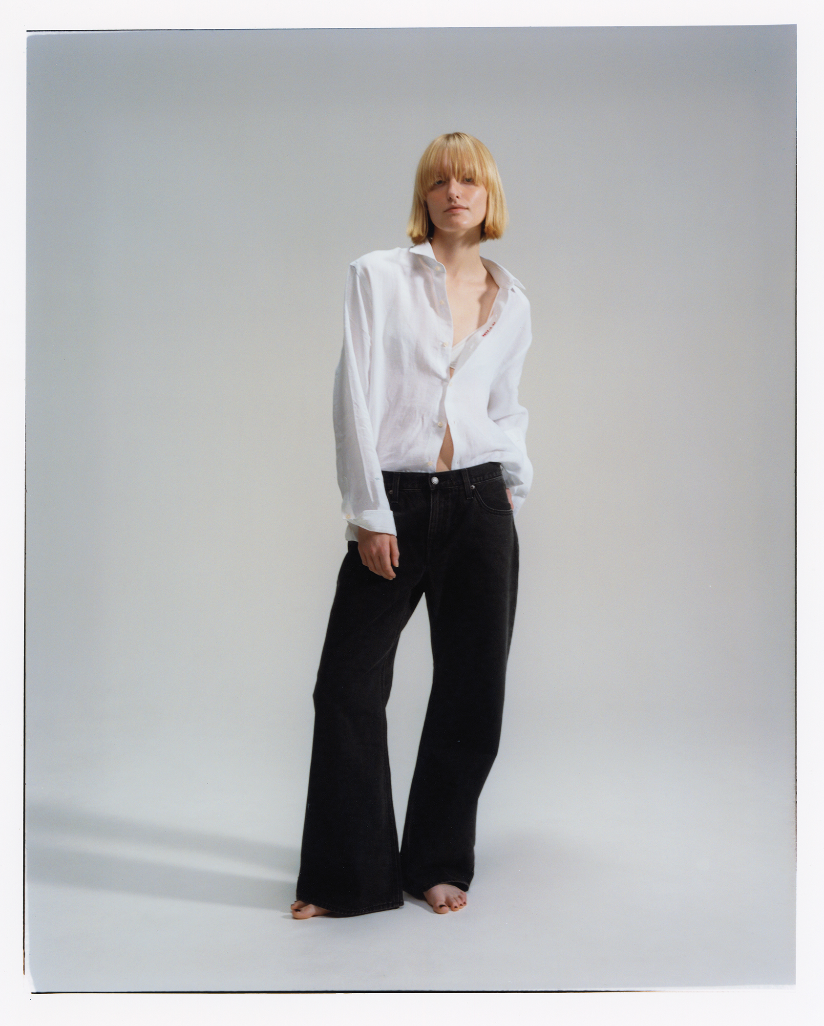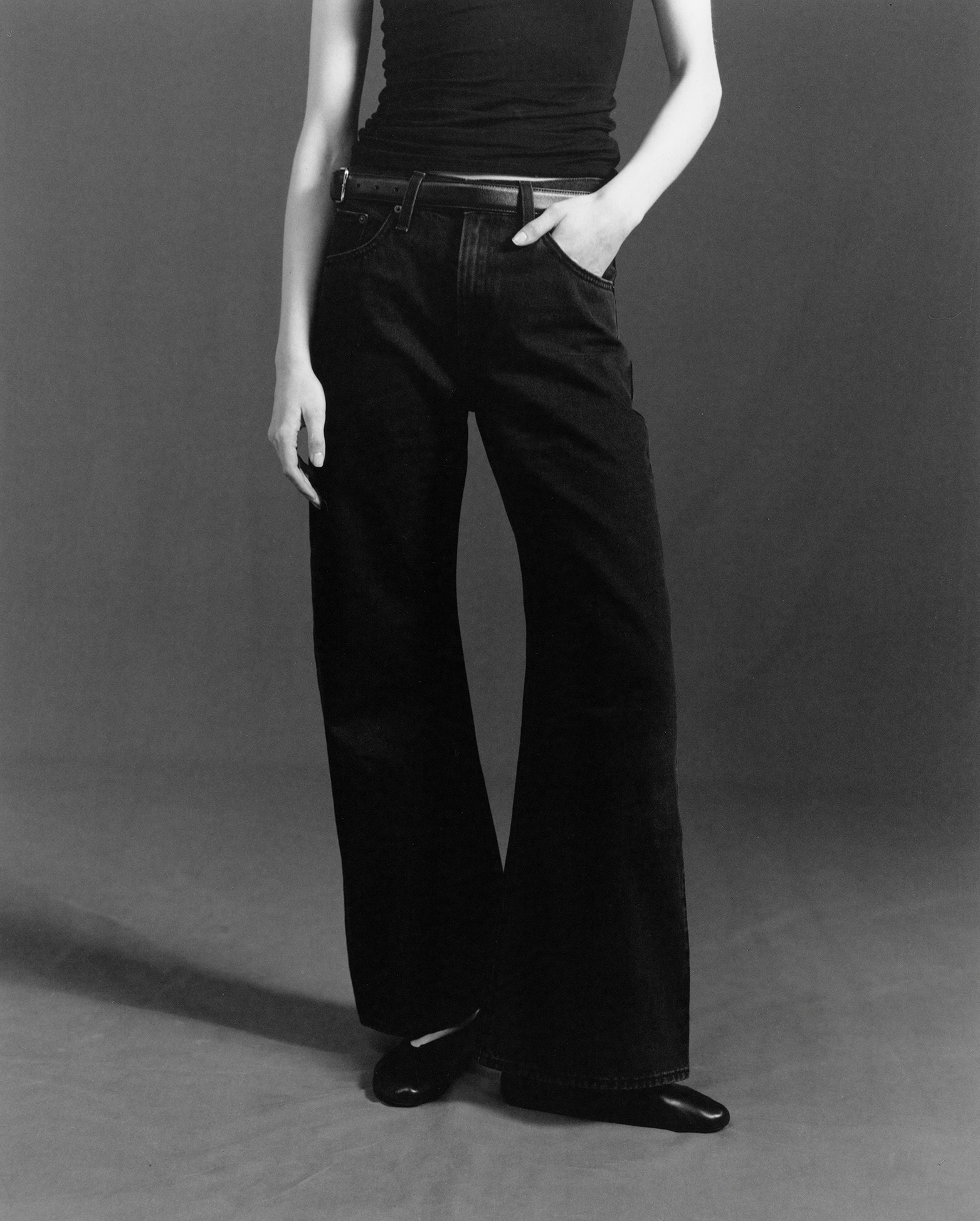 「LOOSE BOOT」は、定番のブーツカットをもっと 気軽に穿けるようにした、女性らしいラインが特徴。MID RISEに設定されたウエスト位置と、膝下がすっと長く見えるフレアシルエットが、全体のバランスを美しく引き立てます。