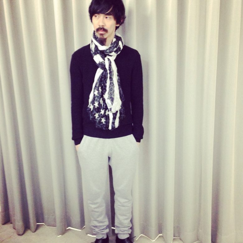 履き心地が良くリブの絞りがあるスウェットパンツとデザインが特徴的なストールはスタイリングのアクセントに!